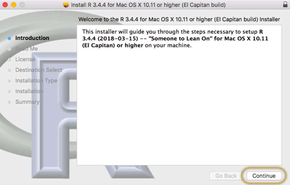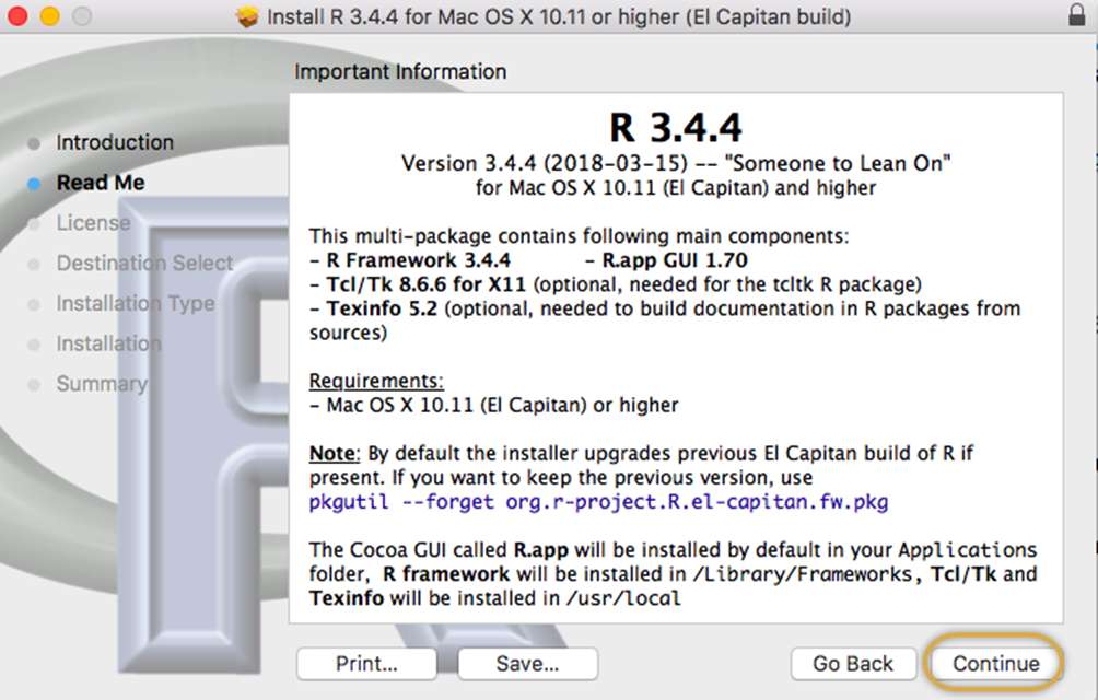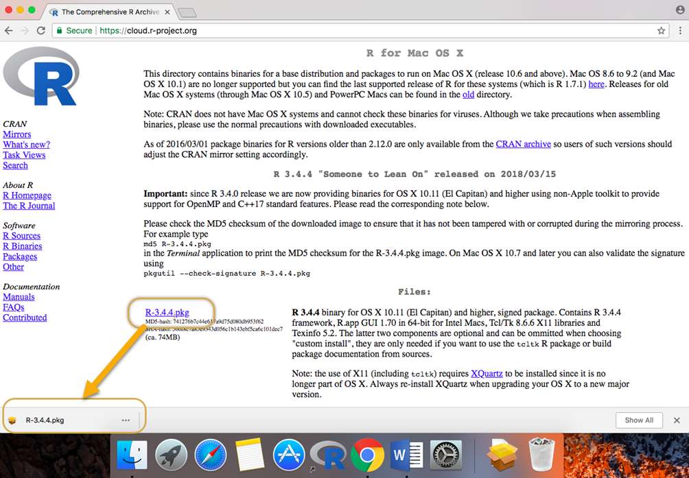 After successfully installing XQuartz, you will now go here and install R: (copy the URL below and paste into Chrome)