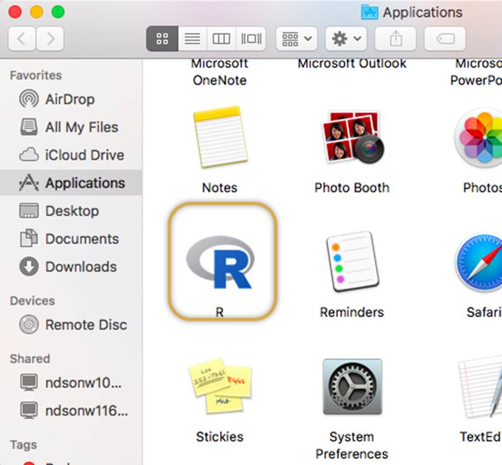 Now we will launch R and from within R will install R-Commander. Go to your applications folder and Find R. The icon looks like this: