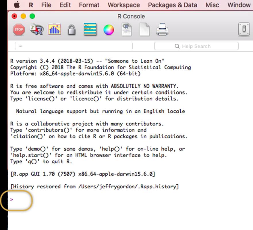 At the prompt type in: library(Rcmdr) with no spaces. You may copy/paste from here. You will do this EVERY TIME you launch the application. The first time though, it may tell you that you need to download some required packages. Accept the defaults and download those packages. After those packages are downloaded and installed the first time, you will not be asked again to do so.