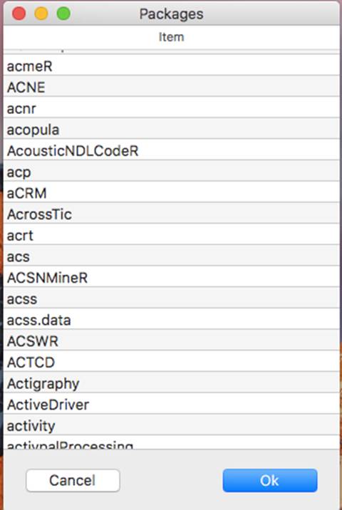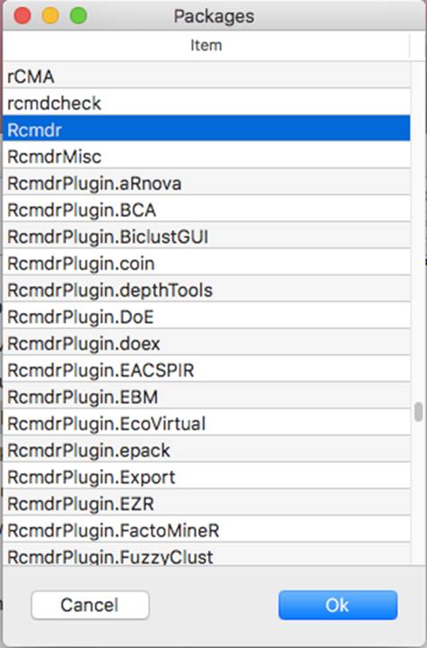 Look for Rcmdr. There will be a number of Rcmdr plug-ins that follow but you are only interested in the first one. Select it and click “OK”.