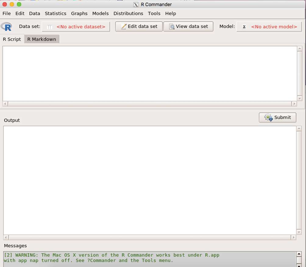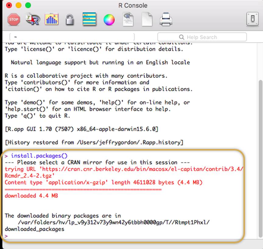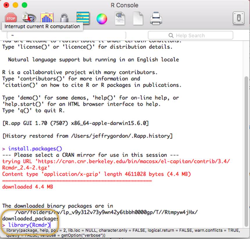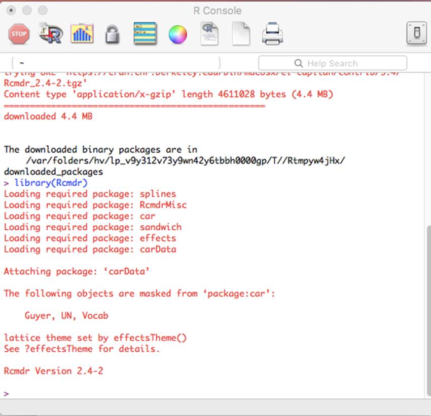 R-Commander has been downloaded and installed. You may be prompted to install additional packages that may not have come down in the most recent package. Go ahead and do that if asked.